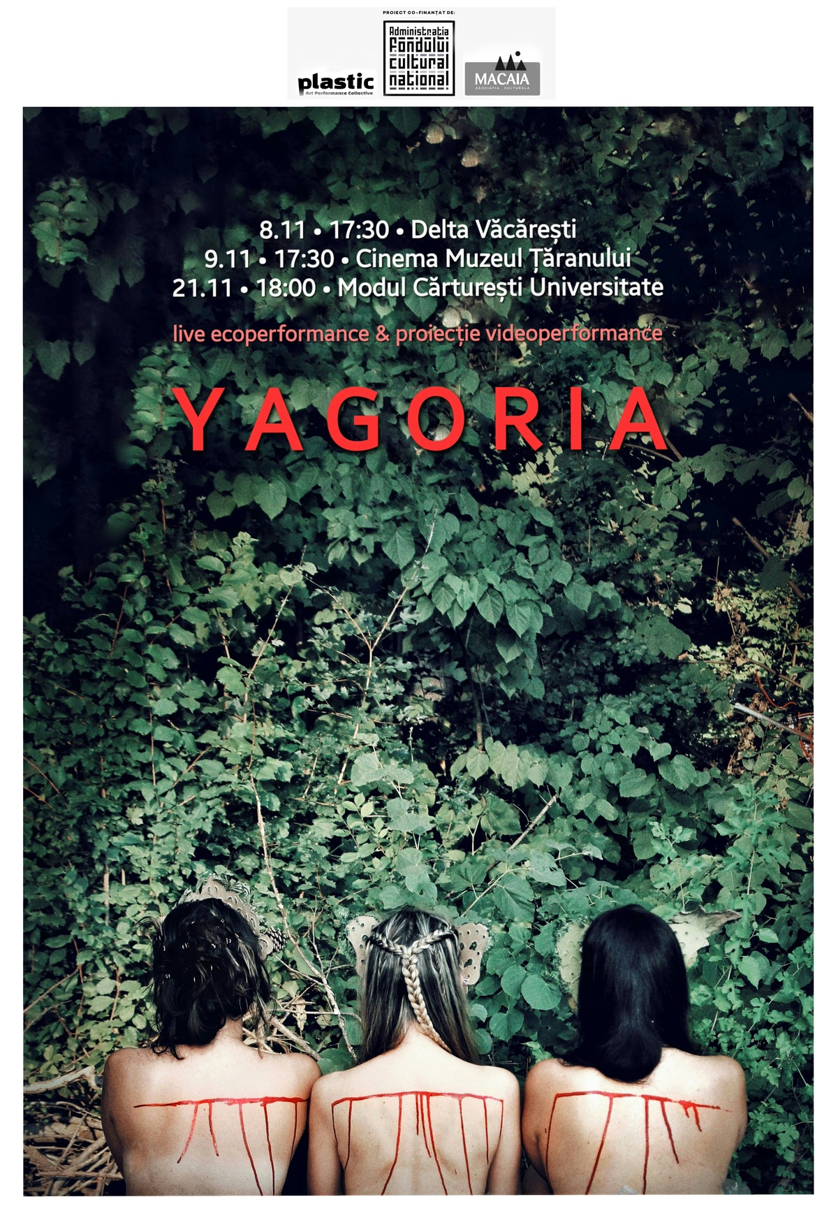 Asociația Macaia, prin Plastic Art Performance Collective, lansează în luna noiembrie cele două produse principale ale proiectului YAGORIA: o instalație ecoperformativă și un ecovideoperformance, ce vor avea loc în trei spații partenere din București.