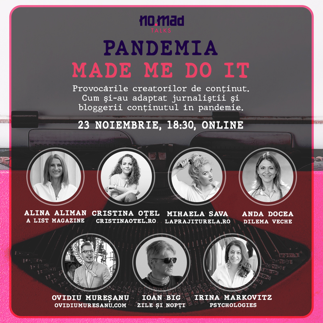 După ce a dat cuvântul freelancerilor și antreprenorilor care și-au împărtășit lecțiile învățate în pandemie, NO.MAD Talks abordează nișa creatorilor de conținut la Pandemia Made Me Do It 3.0, eveniment online care va avea loc pe 23 noiembrie, de la 18:30, online. Cinci reprezentanți ai publicațiilor și trei bloggeri vor povesti despre provocările întâmpinate în 2020 într-un format nou de discuție pentru care sunt disponibile bilete pe Eventbook.