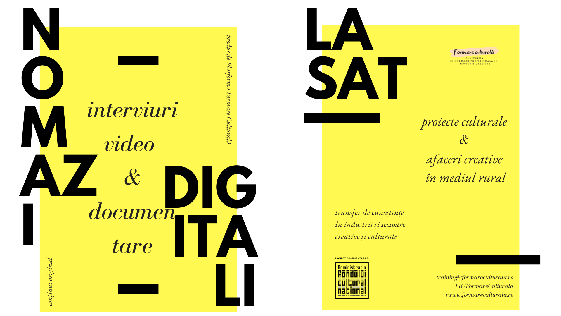 În proiectul „Nomazi digitali la sat”, produs de platforma Formare Culturală, sunt realizate interviuri cu operatori culturali, artiști, antropologi, avocați, sociologi, comunicatori, jurnaliști, fotografi, sociologi, curatori, antreprenori, muzicieni, profesori, etnologi despre proiecte creative și culturale în mediul rural și comunități mici. A fost aleasă metoda de transfer de cunoștințe prin interviuri video, folosind ghiduri de interviu elaborate specific.