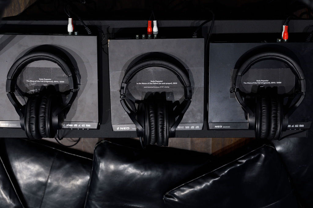 Lucrarea Vedei Popovici este concepută ca o lucrare de sunet performativă care se întoarce dintr-un viitor post-apocaliptic imaginat – funcționând astfel și ca artefact contrafactual și instrument mnemotehnic în raport cu această istorie bidirecțională –, în care are loc un efort concertat de abolire a sistemelor opresive – din interior. Căderea, prezentă atât în performance-ul audio, cât și grafic, în desenele și indicațiile „Manualului pentru Acum-Cădere [Now-Fall Handbook]”, reprezintă un fel de antrenament-antidot năucitor, prin care complicitatea tuturor participanților este exorcizată, frica de a abandona lumea cunoscută este îmbrățișată, devenind un ritual de trecere către o transformare radicală a societății. Prin vocea fascinant-liniștitoare a artistei, un scenariu inițial terifiant-distopic devine afirmativ pentru o nouă viață, sugerând posibilități infinite.