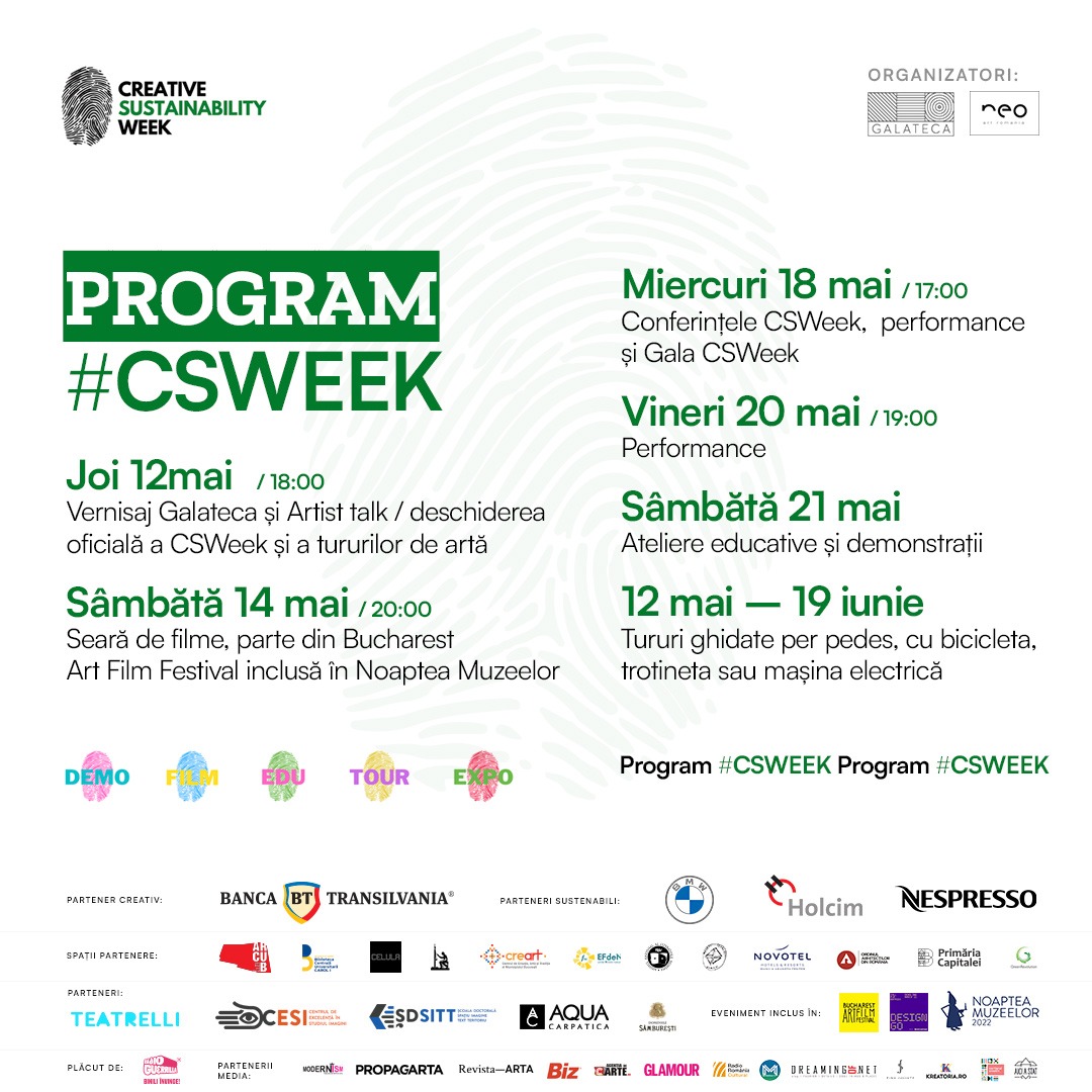 Galeria Galateca și Asociația Culturală Neo Art România lansează în perioada 12 – 21 mai 2022 ediția pilot a proiectului CSWeek - SĂPTĂMÂNA CREATIVITĂȚII SUSTENABILE ce își propune să aducă împreună comunități diferite, artiști, industrii creative, mediul corporate, activiști și ONG-uri, publicul larg, pentru a prezenta inițiative sustenabile pozitive, creatori, expoziții, soluții, reunite pe o platformă a sustenabilității creative.
