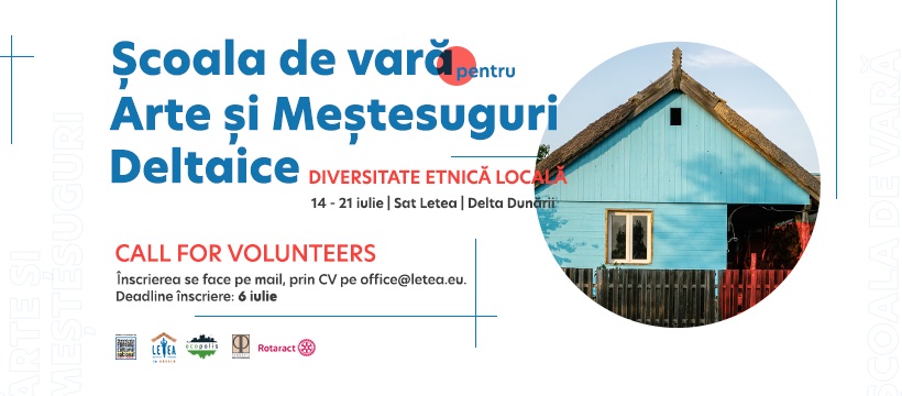 Asociația Letea în UNESCO organizează, în perioada 14-21 iulie, cea de-a treia ediție a Școlii de Vară pentru Arte și Meșteșuguri Deltaice, în cel mai izolat sat din Delta Dunării – Letea și invită persoanele interesate să participe prin trimiterea unui CV pe adresa office@letea.eu până pe 6 iulie.