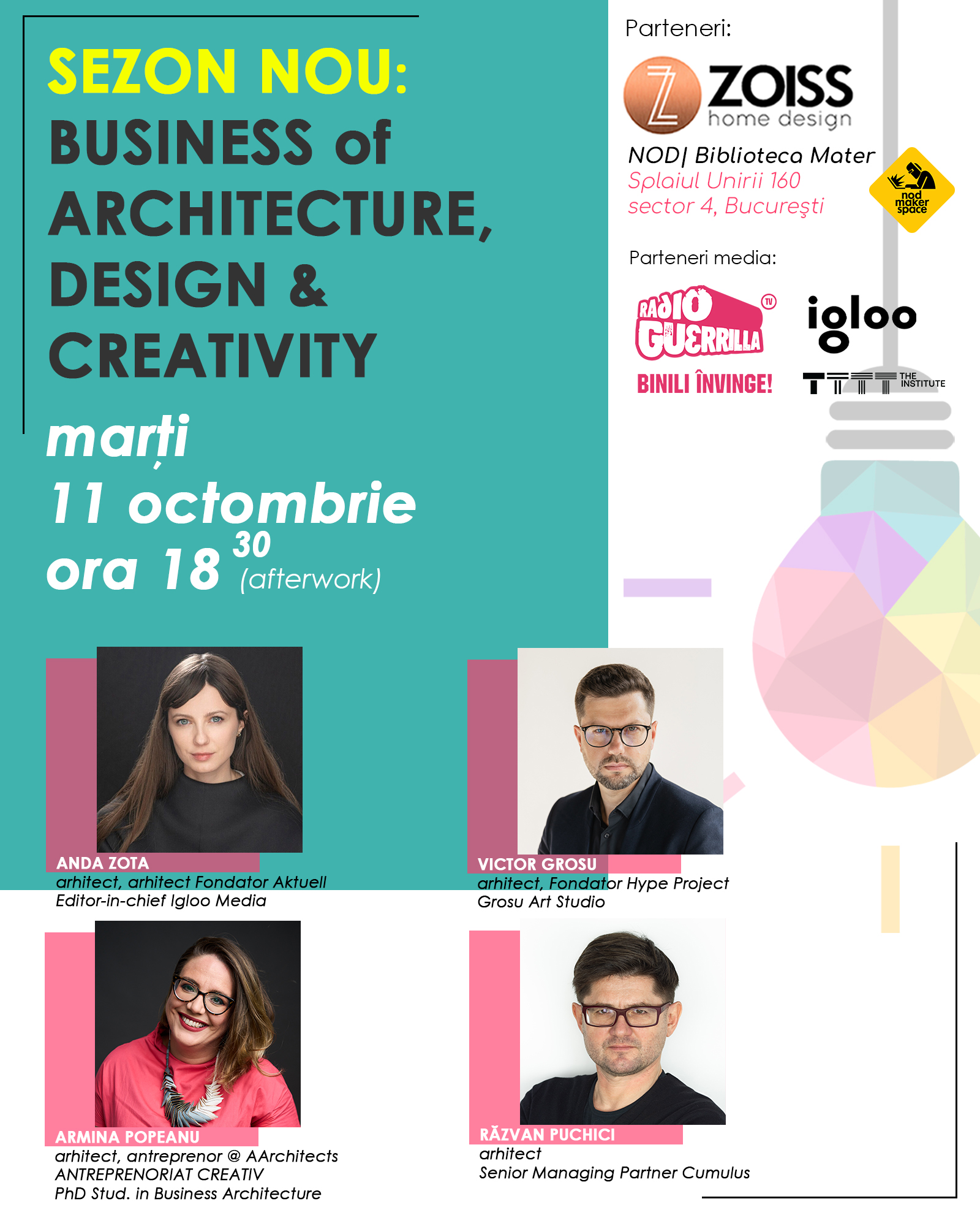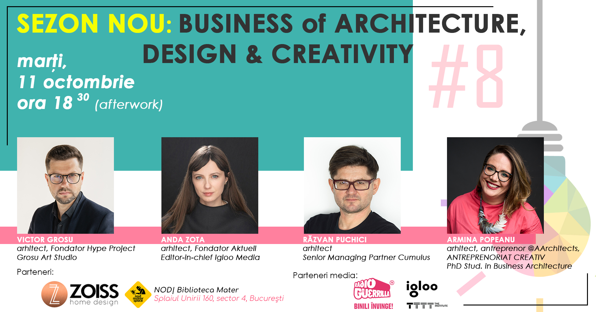 Aflate la a 8a ediție, întâlnirile de business și networking desfășurate sub bagheta – a Business of Architecture, Design & Creativity Society, revin într-un sezon nou, de marți, 11 octombrie 2022, de la ora 18:30 la NOD – Biblioteca MATER, pe Splaiul Unirii 160. Singurele întâlniri de antreprenoriat creativ, de arhitectură și design au fost inițiate de Armina Popeanu, arhitect și fondatorul platformei educaționale ANTREPRENORIAT CREATIV. Prima ediție a acestui sezon este dedicată promovării în businessuri de arhitectură și design și îi are ca invitați pe Victor Grosu @Hype Project Interiors @Grosu Media, Anda Zota @Aktuell @Igloo și Răzvan Puchici @Cumulus Architecture.