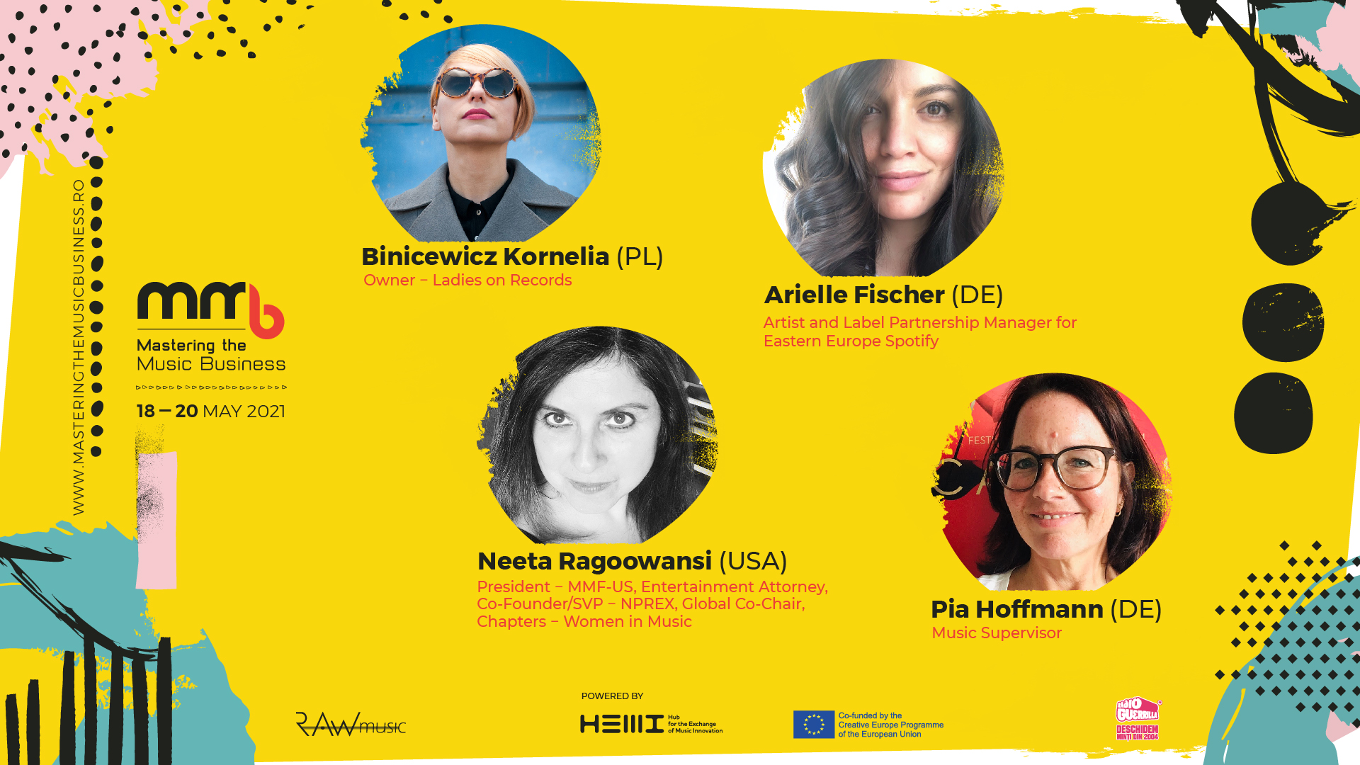 Printre invitatele ediției de anul ăsta se numără Arielle Fischer (DE), Artist and Label Partnership Manager pentru Europa de Est la Spotify, Neeta Ragoowansi (USA), președinte Music Managers Forum USA și Global Co-Chair Women in Music, Kornelia Binicewicz (PL), fondatoarea brandului Ladies on Records și Pia Hoffman (DE), compozitor și supervizor de muzică de film.