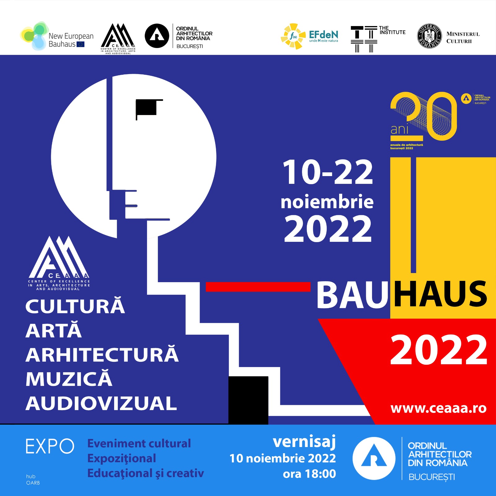 Ordinul Arhitecților din România – Filiala Teritorială București împreună cu Centrul de Excelență în Arhitectură, Arte și Audiovizual (C.E.A.A.A.) și partenerii săi prezintă proiectul expozițional, educațional și creativ intitulat „BAUHAUS 2022". Proiectul expozițional, educațional și creativ intitulat „BAUHAUS 2022 " va fi vernisat pe 10 noiembrie 2022 la sediul filialei, în Sala de expoziție, ora 18:00, intrare din Strada Sfântul Constantin 32.