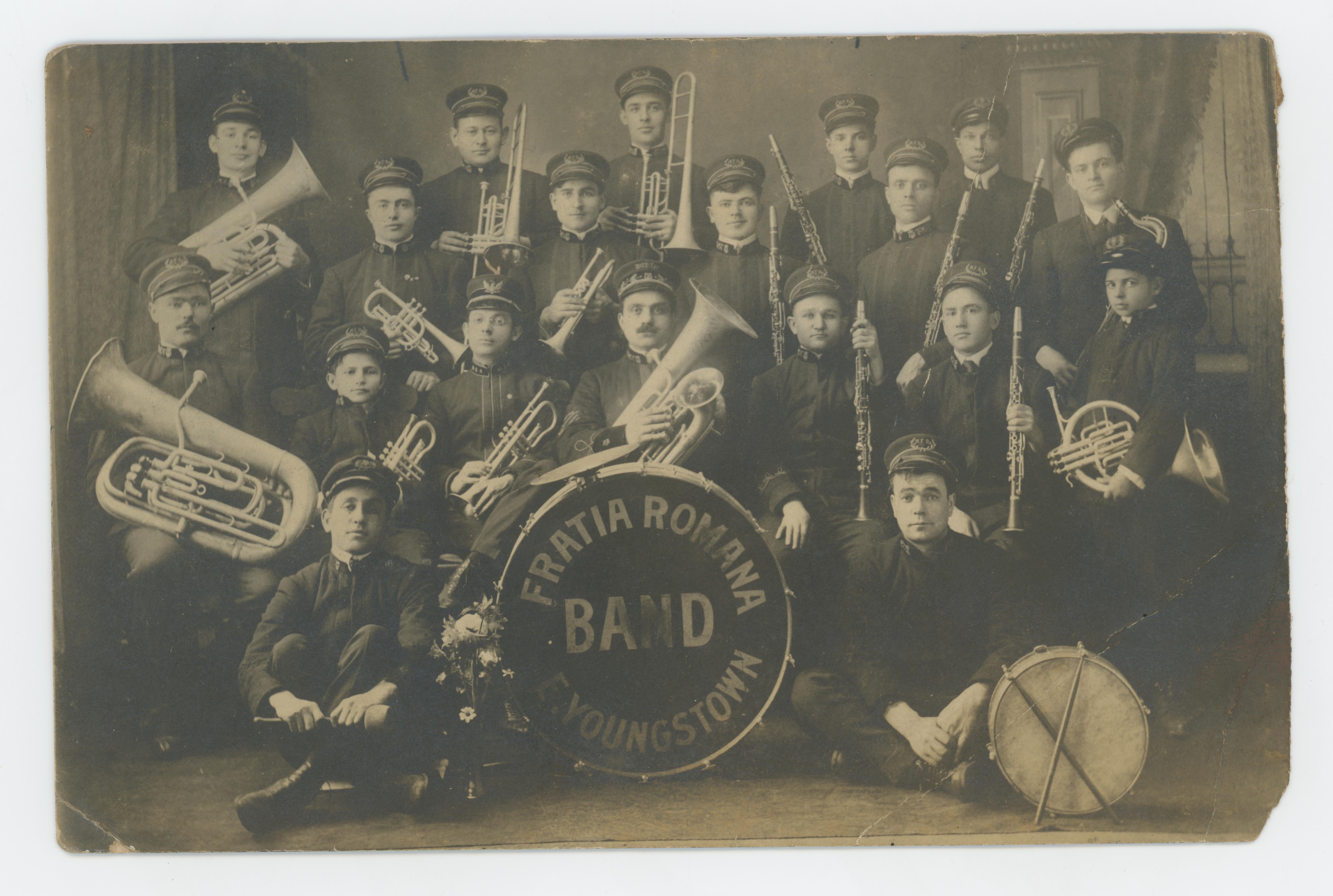 Poza din fața fierăriei; Frăția Română Band Youngstown - un singur personaj identificat, Simion Fusarău ande Boieriu (unchiul pictorului Ștefan Câlția)