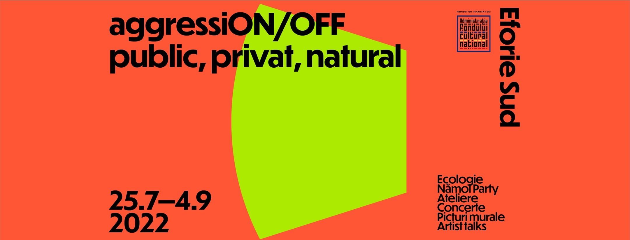 aggressiON/OFF: public, privat, natural. Proiectul reunește, sub tema artei sociale și a ecologiei, reprezentanți ai scenei artistice, autorități locale, alături de activiști și jurnaliști specializați pe subiecte de mediu. Personalități culturale precum Lia Perjovschi și Dan Perjovschi (prezenți în acest an la evenimente artistice prestigioase, precum documenta 15 și Art Basel), Irina Botea - reper al artei video și profesoară la Institutul de Artă din Chicago, Diana Miron și Laurențiu Coțac - sound artiști cunoscuți internațional, Emil Cristian Ghiță - artist cunoscut pentru intervențiile sale ecologice și manager la Centrul Ceh, David Tăicuțu - practicant de Mud Graffiti, sau activiști din scena culturală, precum Cristian Neagoe, își vor întâlni publicul în cadrul unor sesiuni de eco-performance, muzică experimentală sau în dezbateri care chestionează potențialul simbiotic dintre uman, natură și tehnologie. Invitații vor explora atât spațiul de întâlnire dintre cultură și mediu sau relația între proiecte eșuate și ecosisteme benefice, cât și propriile viziuni apărute în încercare de a-și abandona identitățile socio-culturale, pentru a deveni mai puțin individ și mai mult natură.
