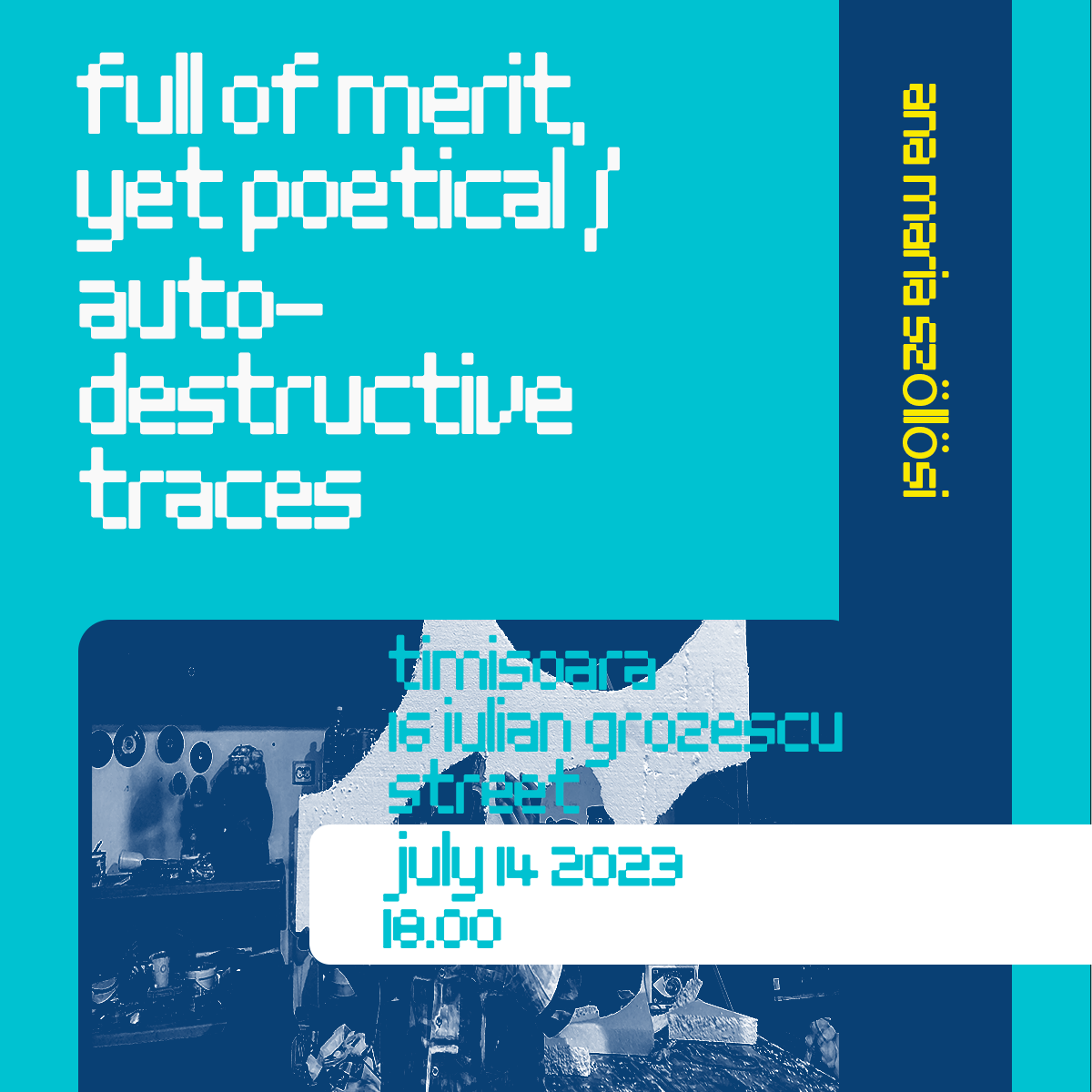 Publicul timișorean este așteptat vineri, 14 iulie, 2023, ora 18.00, pentru a o însoți pe artista Ana Maria Szöllösi în performance-ul lucrării „Full of Merit, Yet Poetical / Auto-Destructive Traces”. Performance-ul constă într-o minge din cretă care va fi rostogolită prin oraș de artistă până când se va dezintegra. Urma performance-ului rămâne ca o operă de artă efemeră ce a fost influențată de contextul și condițiile întâlnite pe parcurs și servește drept un martor tăcut al modului în care interacționăm cu spațiile publice.