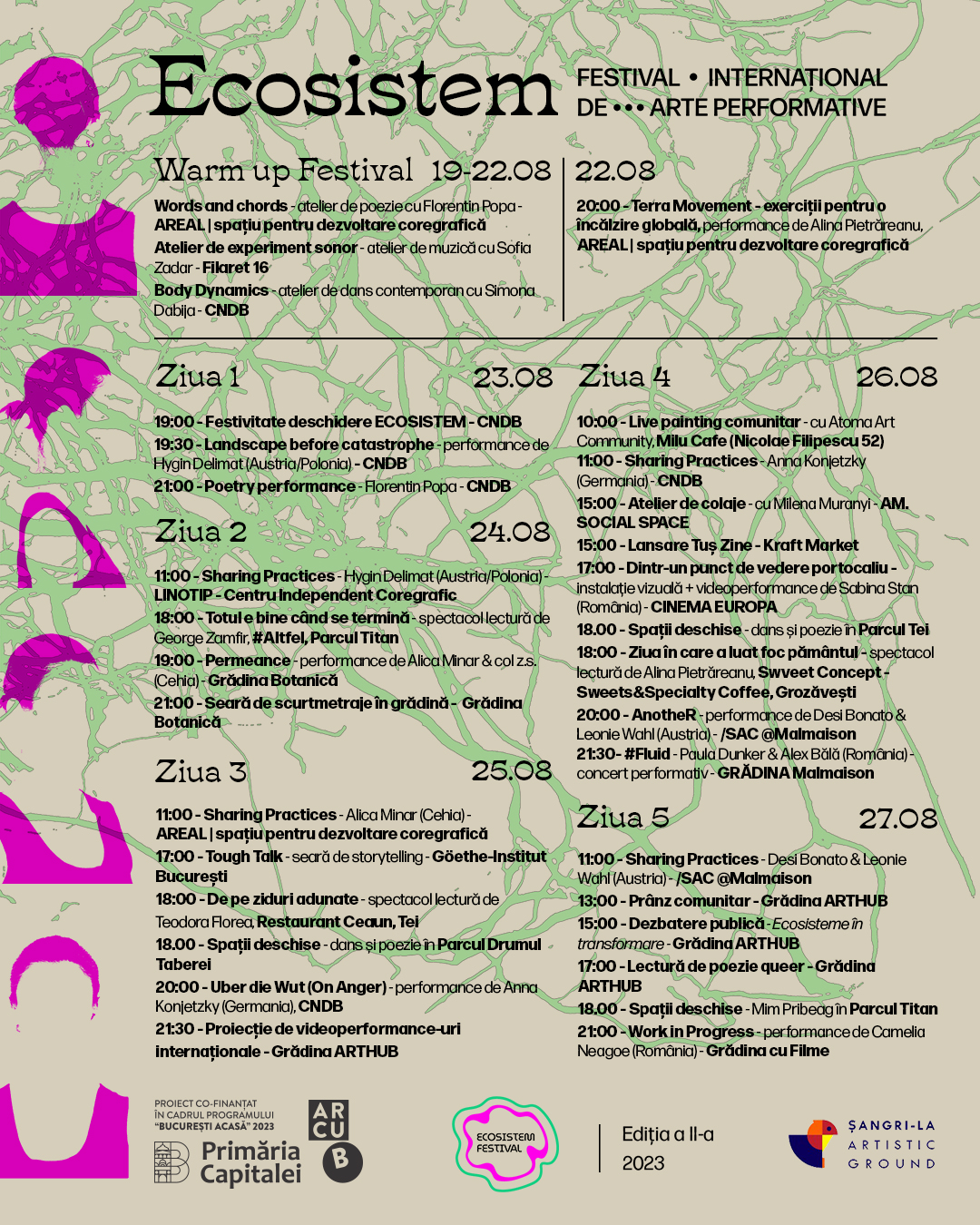 Cea de-a doua ediție a festivalului ECOSISTEM” aduce un line-up impresionant și divers. Anul acesta, sunt invitate performance-uri cu artiști din Germania, Austria, Polonia, Cehia și România, alături de multe alte evenimente, desfășurate pe parcursul a nouă zile.