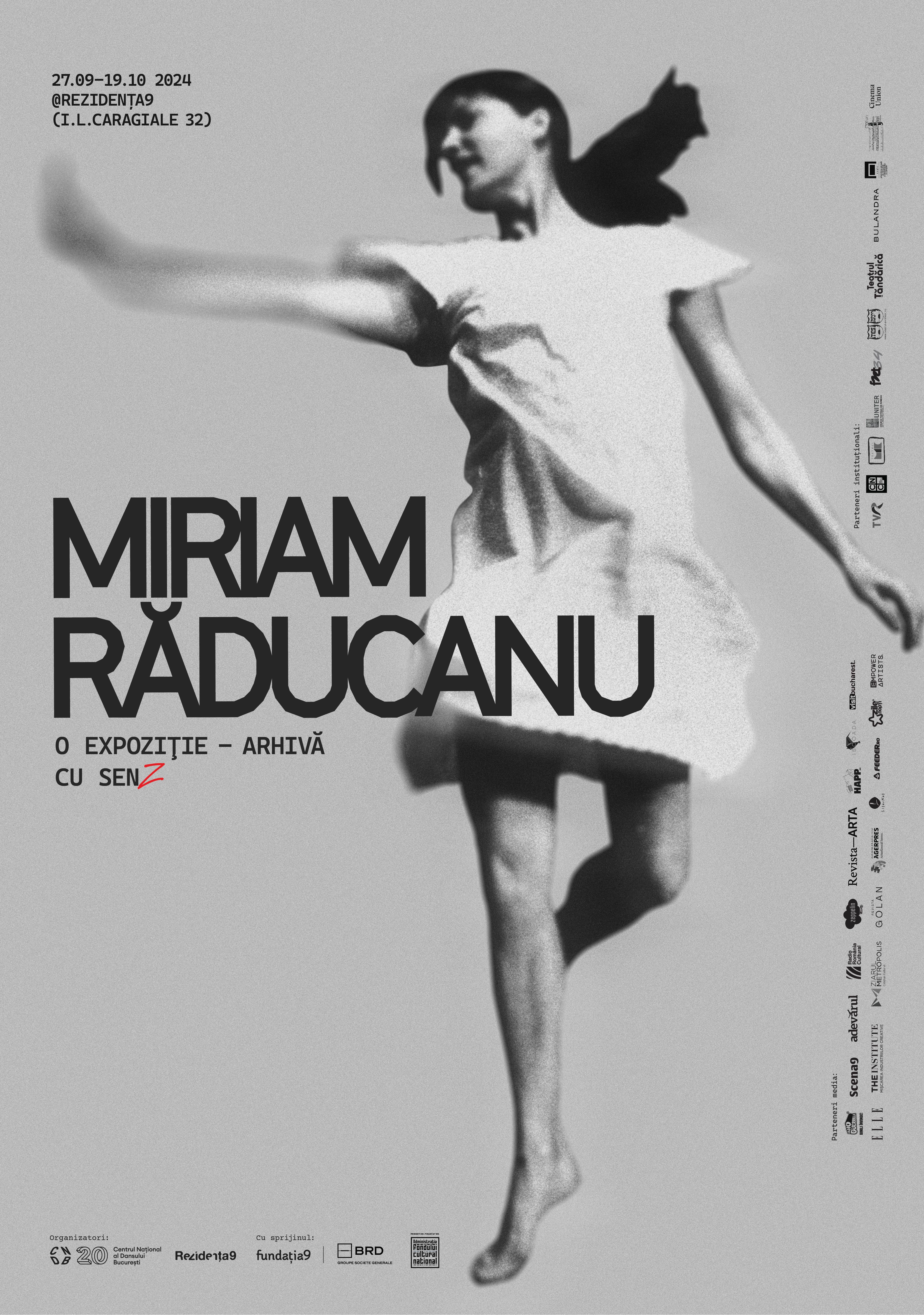 În perioada 27 septembrie - 19 octombrie, Centrul Național al Dansului București și Rezidența9 organizează o expoziție amplă dedicată coregrafei și dansatoarei Miriam Răducanu și a impactului pe care l-a avut asupra mai multor generații de artiști. Vernisajul are loc în data de 27 septembrie, ora 19:00, la Rezidența9, iar până la finalul perioadei expoziționale, publicul are ocazia să participe la o serie de evenimente.