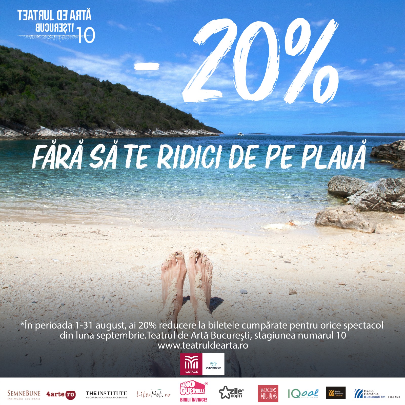 Cu bucurie, așadar, la intrarea în cea de-a zecea stagiune, Teatrul de Artă București a pregătit o surpriză publicului: programul lunii septembrie este gata, iar în perioada 1 – 31 august, biletele au o reducere de 20%.