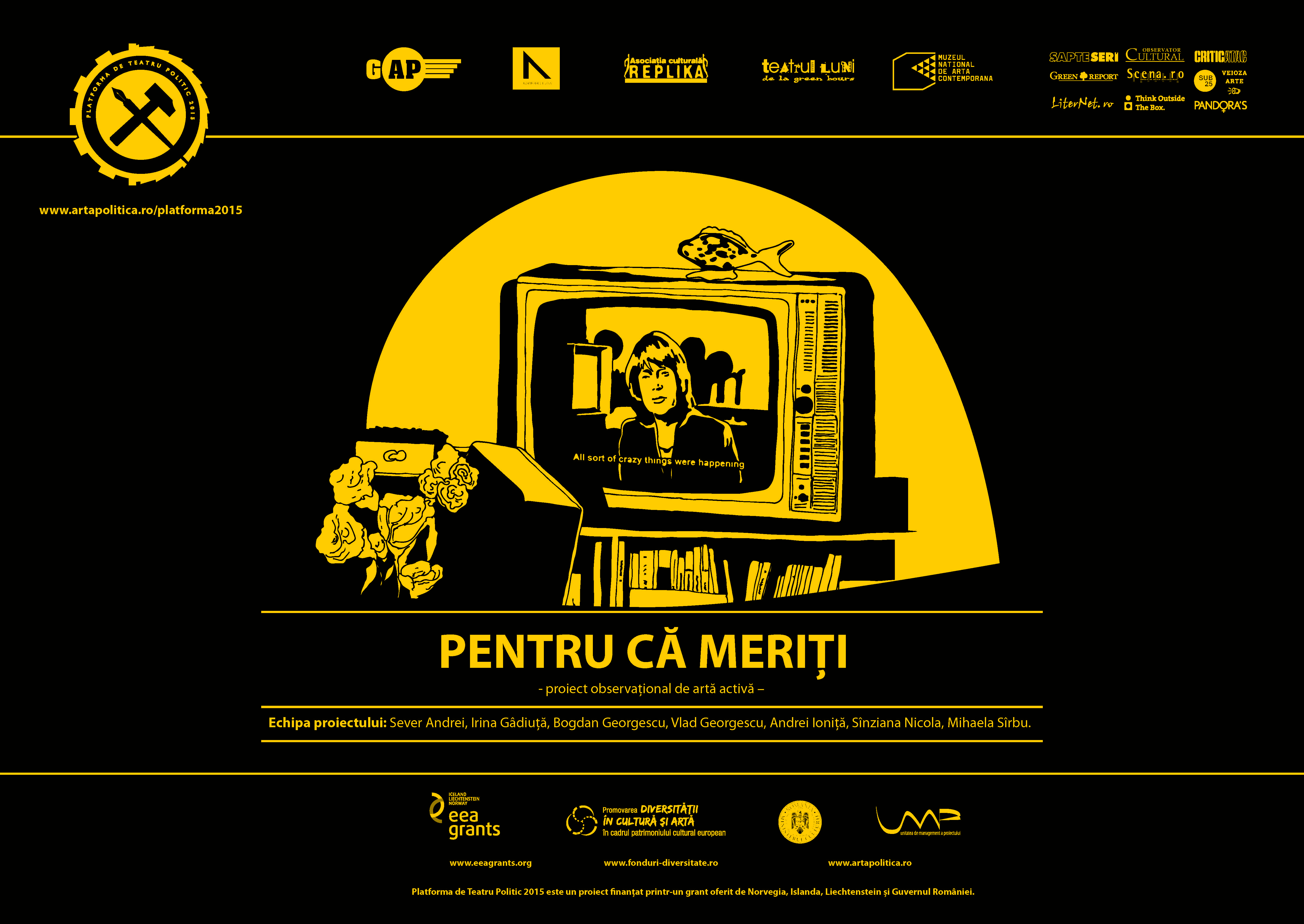 Spectacolul „Pentru că Meriți”, din cadrul Platformei de Teatru Politic 2015, va avea premiera pe 28, 29, 30 august, la ora 20.00, la Muzeul Național de Artă Contemporană (MNAC), sala Auditorium. Piesa pune accentul în mod deosebit pe acele abuzuri legate de puterea de decizie a femeilor asupra propriului lor corp. Propunerea legislativă privind înființarea, funcționarea și organizarea cabinetelor de consiliere pentru criza de sarcină, interzicerea avorturilor și raportarea bărbaților români la conceptul de emancipare a femeii în anul 2015 sunt subiecte explorate în spectacol printr-un proces creativ de artă activă atât observațional cât și ficțional.