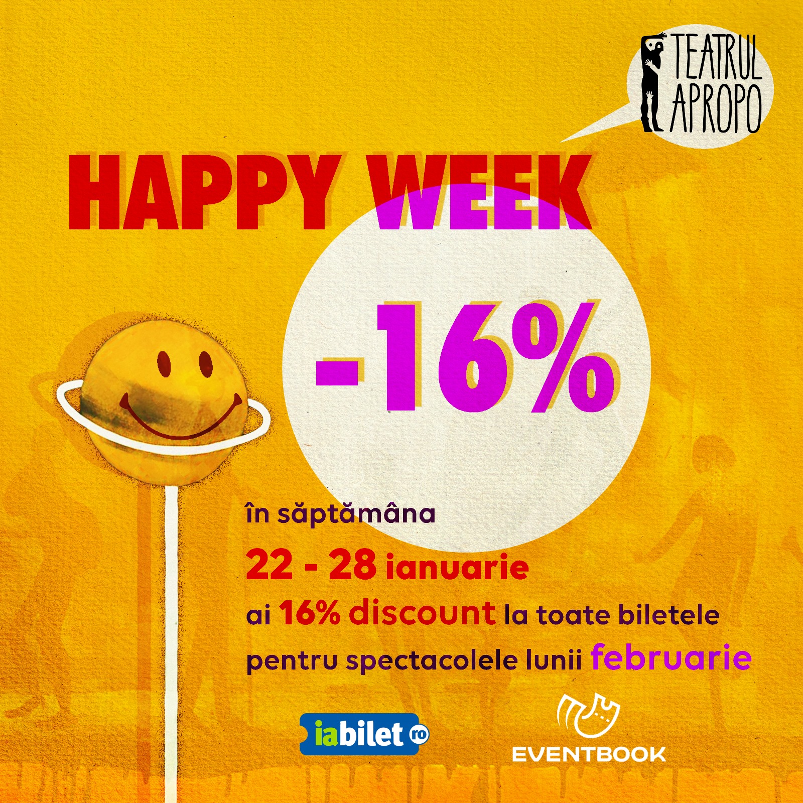 Teatrul Apropo anunță programul de spectacole pentru luna februarie. Plus o surpriză frumoasă: săptămâna 22 – 28 ianuarie este the Happy Week – săptămâna în care puteți cumpăra bilete la oricare dintre spectacolele din februarie, cu o reducere de 16%.