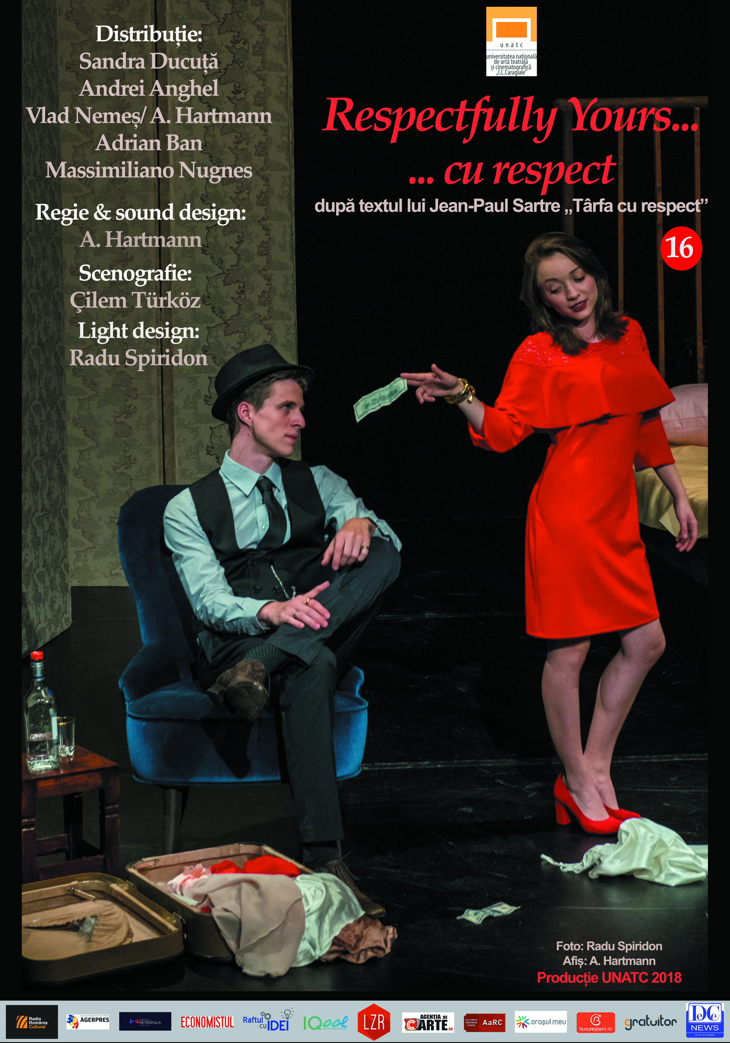 În acest context, spectacolul Respectfully yours…/ … cu respect vine să arate că omul poate să reziste presiunilor societății, a normelor și a oamenilor dacă alege să o facă. În mod evident, asumându-și și consecințele alegerilor sale: de a fi ostracizat, hărțuit, manipulat până la a-și trăda valorile, aruncat de către ceilalți și abandonat într-un iad personal din care puține sunt căile de evadare.” A. Hartmann