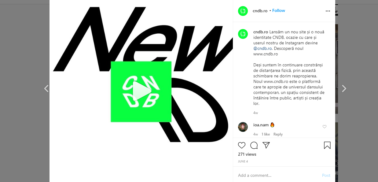 În categoria Digital are Mențiune și campania de rebranding a Centrului Național al Dansului București, semnată de Daniel&Andrew Studio. Centrul a anunțat schimbarea site-ului pe contul de Instagram ca un gest de apropiere adaptată vremurilor de distanțare socială.