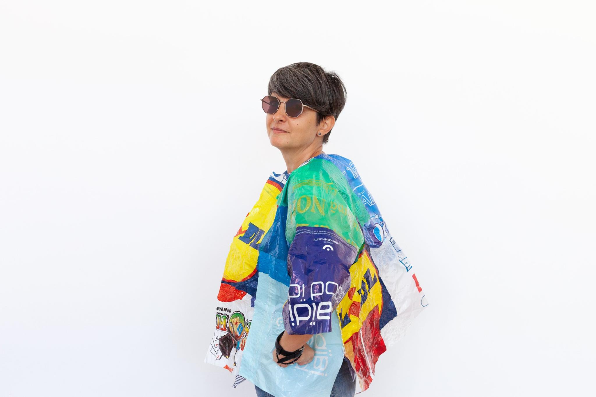 Lucrările lui Borbála Ferencz sunt ca niște lămâi reci în miez de vară: culori tari, geometrii clare și mult material reciclat remixat. Borbála este unul dintre puținii designeri români care combină creativitatea și sustenabilitatea în modă, integrând în hainele și accesoriile pe care le face materiale experimentale precum plastic și textile reciclate.