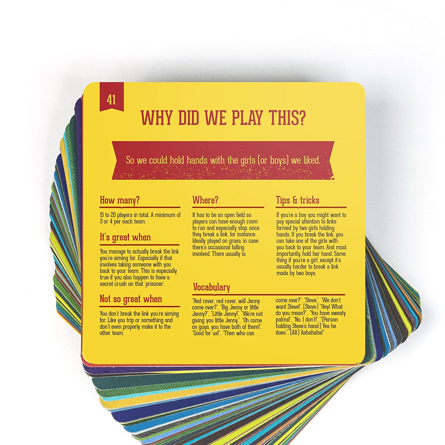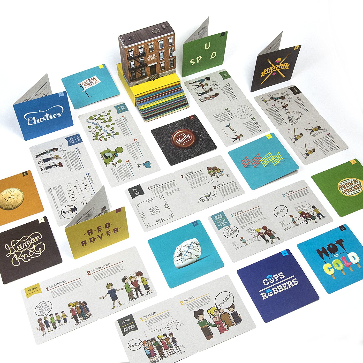 This is a collection of 55 timeless outdoor games, illustrated and explained. It compiles 55 games and "tricks" of the "latchkey generation", inside the covers of a book shaped like a miniature block of flats. It makes adults remember their childhood and little ones can thus learn from them.