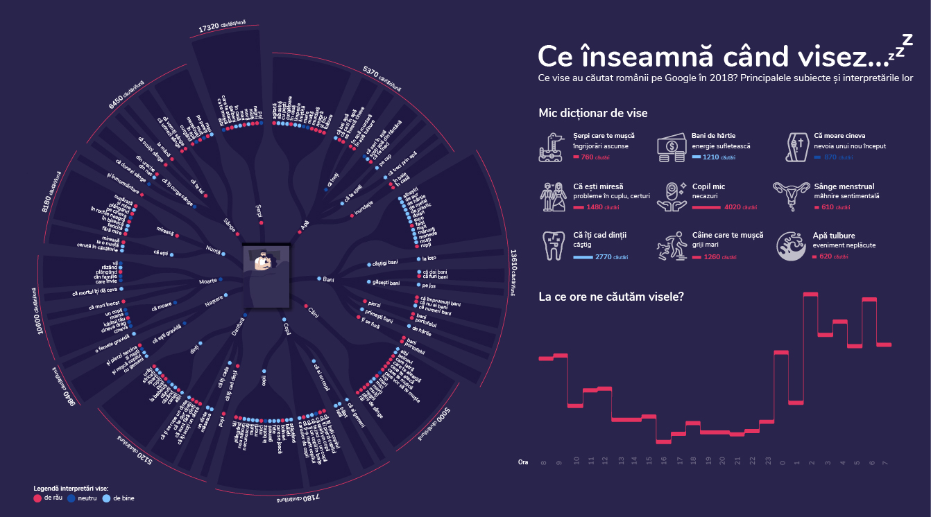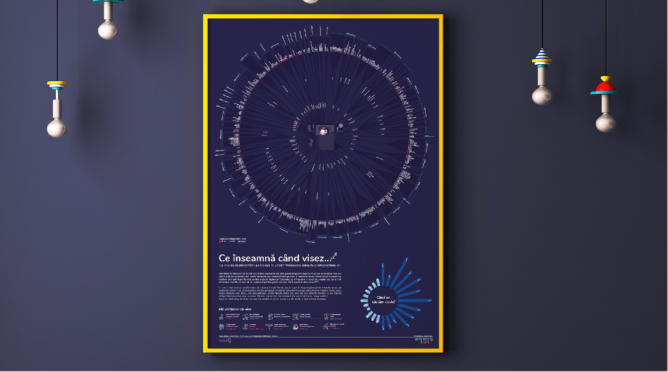 As part of an analysis of Google Trends search preferences, Studio Interrobang and Scena9 stumbled upon the pile of questions people ask regarding the content of their dreams. They have selected the most frequent fifty themes: snakes, money, death, birth, weddings, children, blood, teeth, water, dogs ... then added, for each of them, the most common questions and marked their interpretations, as they appear in one of the most popular sites referring to the topic, www.visele.ro.