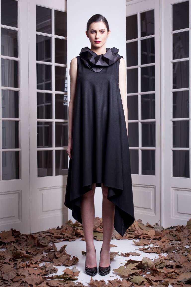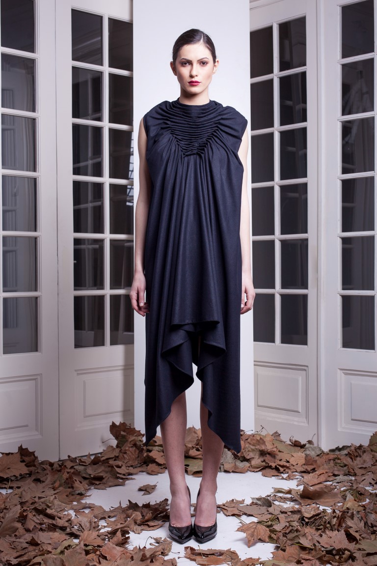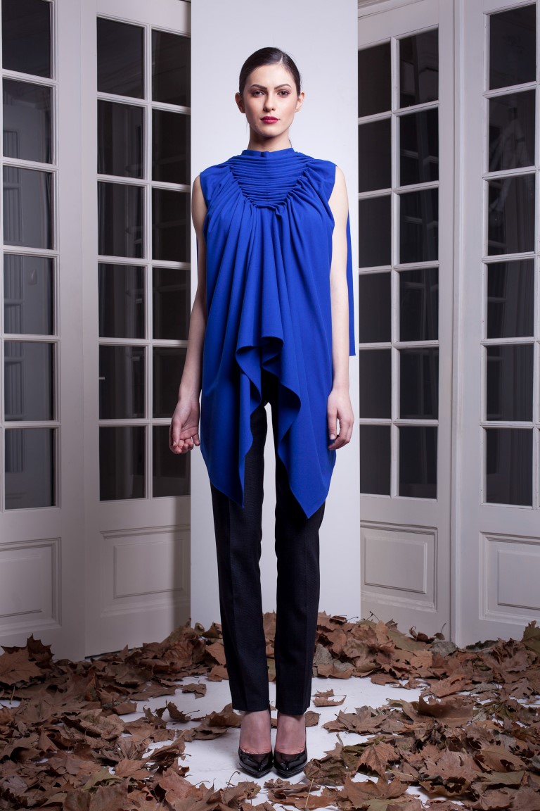 Set in chromatically soft tones and occasionally with some strong accents of royal blue, the pieces of the collection are built from luxurious materials like wool, silk or leather. Lines are feminine and fluid incorporating easy drapes, masculine cuts and geometrical elements creating a modern yet classical, contemporary yet understandable design. It is a proposal we make to women that want to communicate sensuality and force and are looking for clothes to flatter them and be observed by others.