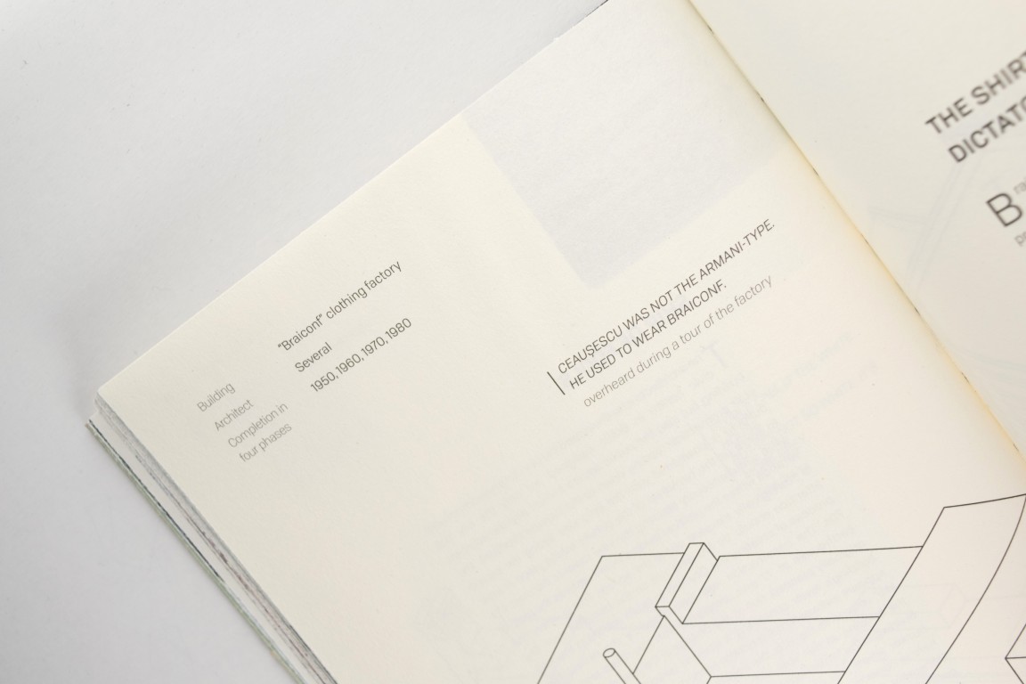 The design reflects the nonlinear research process and the feeling of Norwegian students facing the realities of Braila for the first time with a scrapbook like approach. Photographic inserts with “postcards from Braila” and short essays pop up throughout the book to help the reader build context and get more personal in the exploration. The use of raw, common materials to build a design object with a contemporary feel is in line with the main idea of valuable latent potential in things that appear to be of little worth. The look is also a refined invocation of the socialist industrial era.