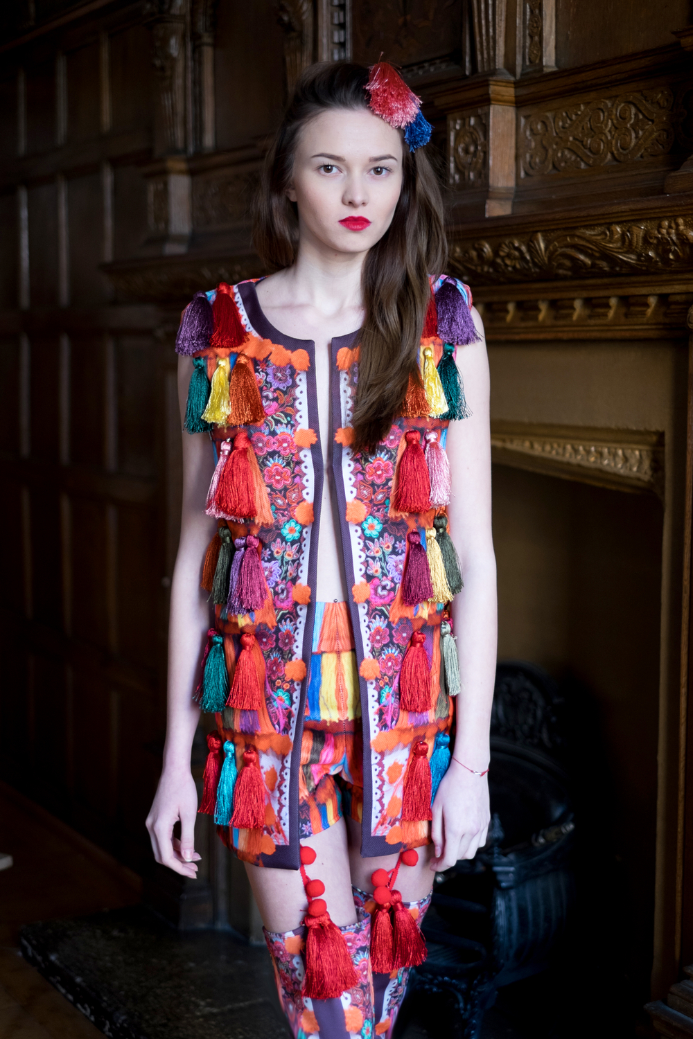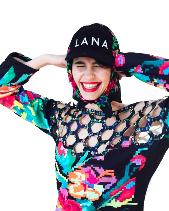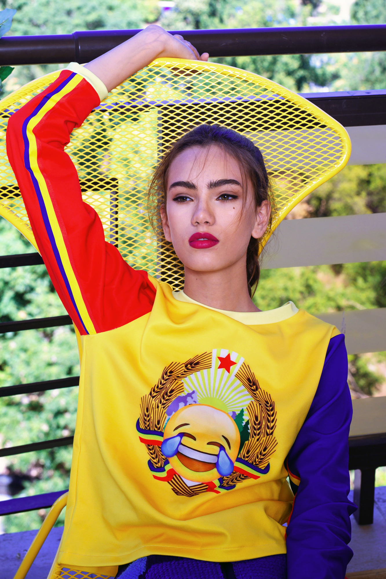The new collection deals with the national past and Lana's memories using nostalgia and humour: from the ritualistic masks from the pre-Romanian traditions turned into the digital masks of today- emojis, to the remix of the domestic kitsch of the 80s, from the iconic coat of arms of Ceau?escu's Romanian Socialist Republic mixed with the laughing with tears emoji, treating that political period as the absurd joke that was, to the traditional carpet from a Romanian peasant’s house turned into the comfy climax of a chic overall.
