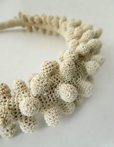 In 2009 Lidia Puica graduated from the Univestity of Decorative Arts and Design in Iasi with specialization in Environmental Design, then she completed a Master at the University of Art and Design in Cluj-Napoca, exploring the contemporary jewelry. After graduation in 2011, she was devoted to jewelry made of unconventional meterials, especially those crochted. Lidia creates statement pieces with organic inspiration using free technique in crochet exploring shapes and volumes. In this way, the jewelry gets the value of an art object, being associated with some crocheted sculptures.