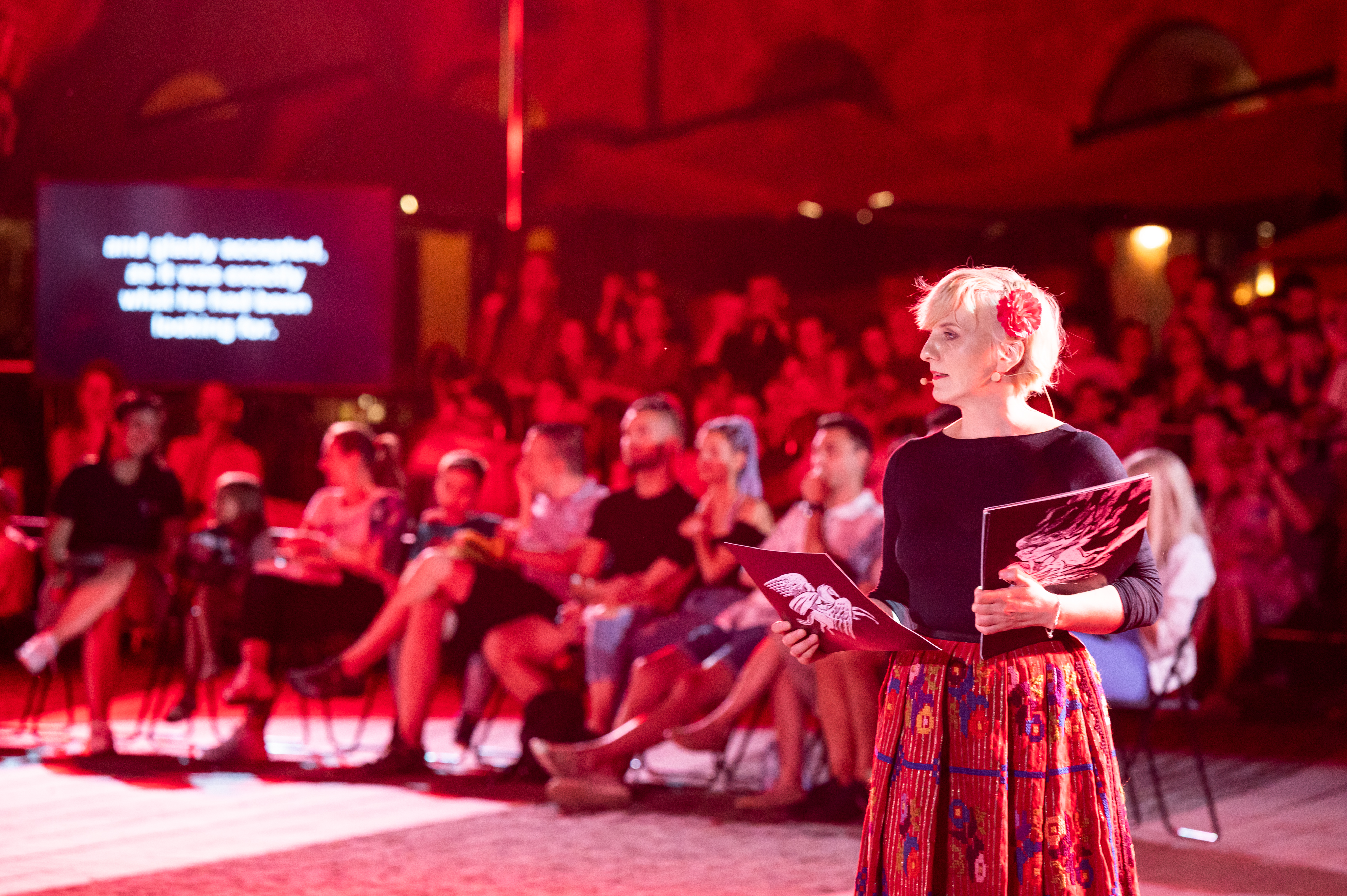 Instantaneu din timpul spectacolului Tinerețe fără Bătrânețe și Viață Fără de Moarte. În partea dreaptă, Christine Cizmaș, în rolul de povestitor/ foto: Dana Moica